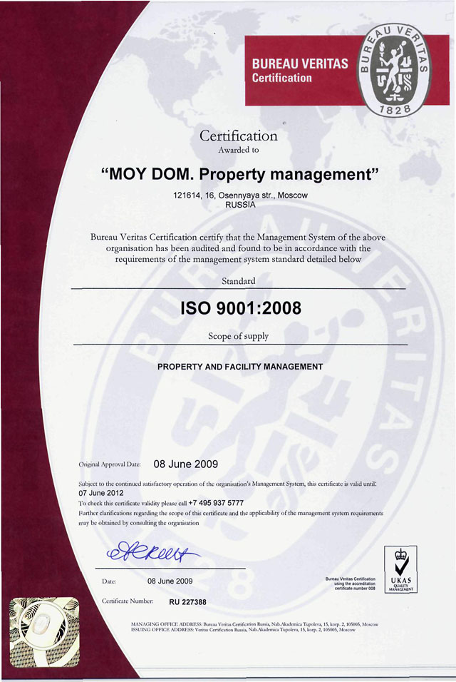 Компетенция, глубокие знания, а также документальные свидетельства, предъявленные ответственными сотрудниками Компании, позволили членам аудиторской группы сделать вывод о том, что в ООО «Мой Дом. Управляющая компания» разработана, документирована, внедрена и поддерживается Система менеджмента качества в соответствии с требованиями Международного стандарта ISO 9001:2008. На основании полученной информации, Компания рекомендована к продлению действующего сертификата соответствия № RU 227388 от 08 июня
