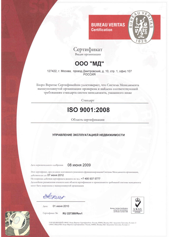 Система менеджмента качества ООО «МД» оценена как результативная, несоответствия и замечания отсутствуют. Компания рекомендована к продлению действующего сертификата соответствия № RU 227388 от 08 июня