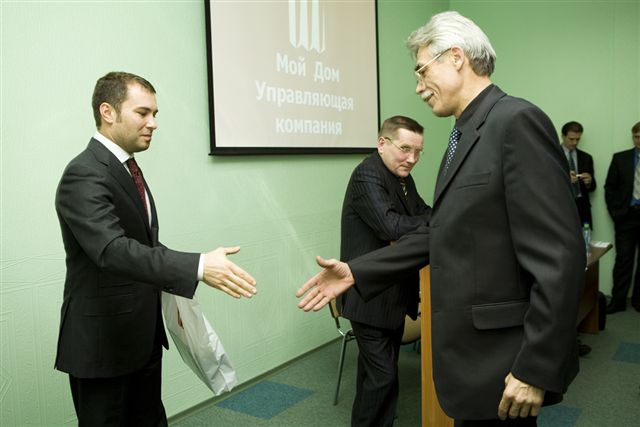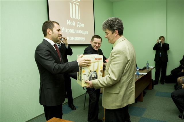 В заключение совещания был доведен приказ Генерального директора ООО «Мой Дом. Управляющая компания» о поощрении инженерно-технического персонала компании по итогам работы за 2007 год. Наиболее отличившимся сотрудникам были вручены ценные подарки, денежные премии, грамоты. Ряду сотрудников установлены персональные оклады.