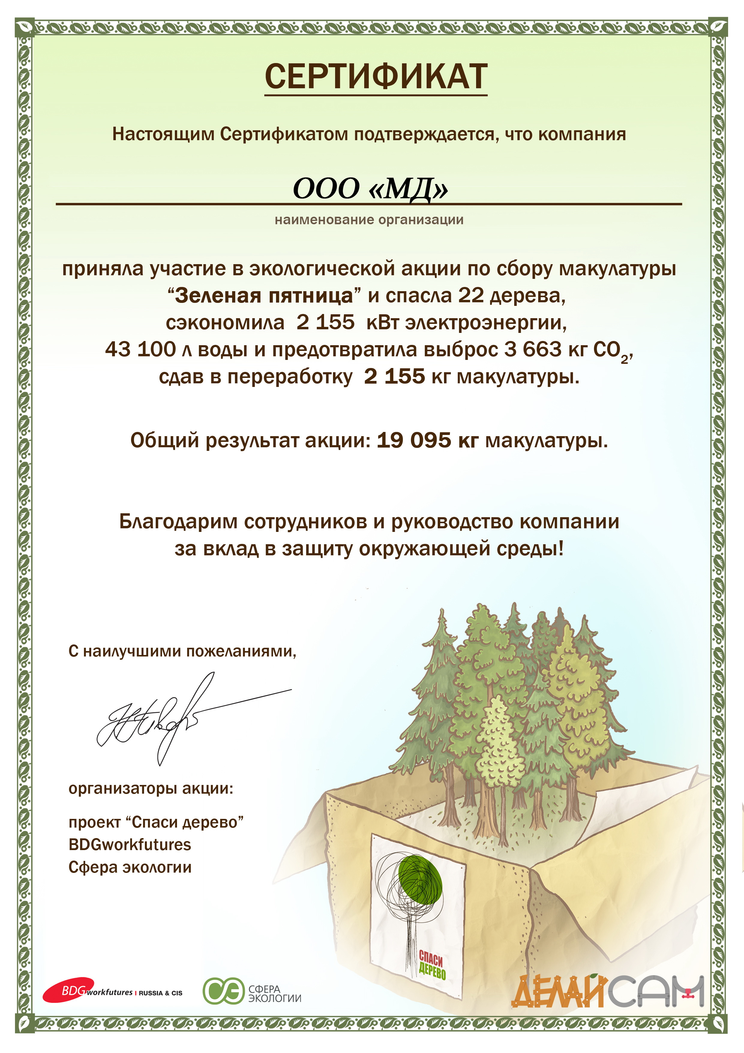 УК MD Facility Management и ДЦ «ЛеФОРТ» приняли участие в экологической акции «Зеленая пятница», проходящей в апреле в бизнес-центрах столицы. Компании сделали свой вклад в сохранении природы, пытаясь спасти от вырубки несколько десятков деревьев. Результаты участия в акции отражены в полученном компанией MD сертификате о сохранении природных ресурсов.