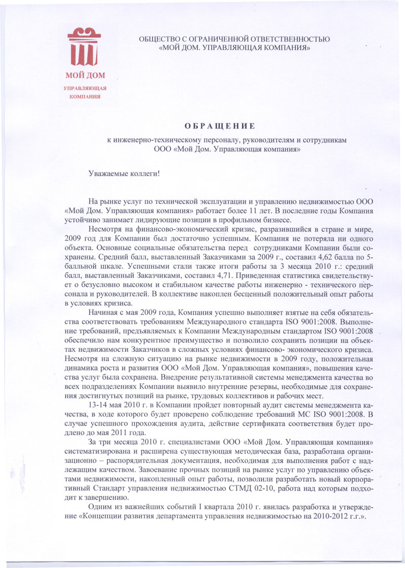 Обращение к сотрудникам ООО "Мой Дом. Управляющая компания"