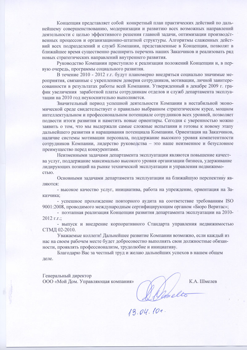 Компетенция, глубокие знания, а также документальные свидетельства, предъявленные ответственными сотрудниками Компании, позволили членам аудиторской группы сделать вывод о том, что в ООО «Мой Дом. Управляющая компания» разработана, документирована, внедрена и поддерживается Система менеджмента качества в соответствии с требованиями Международного стандарта ISO 9001:2008. На основании полученной информации, Компания рекомендована к продлению действующего сертификата соответствия № RU 227388 от 08 июня