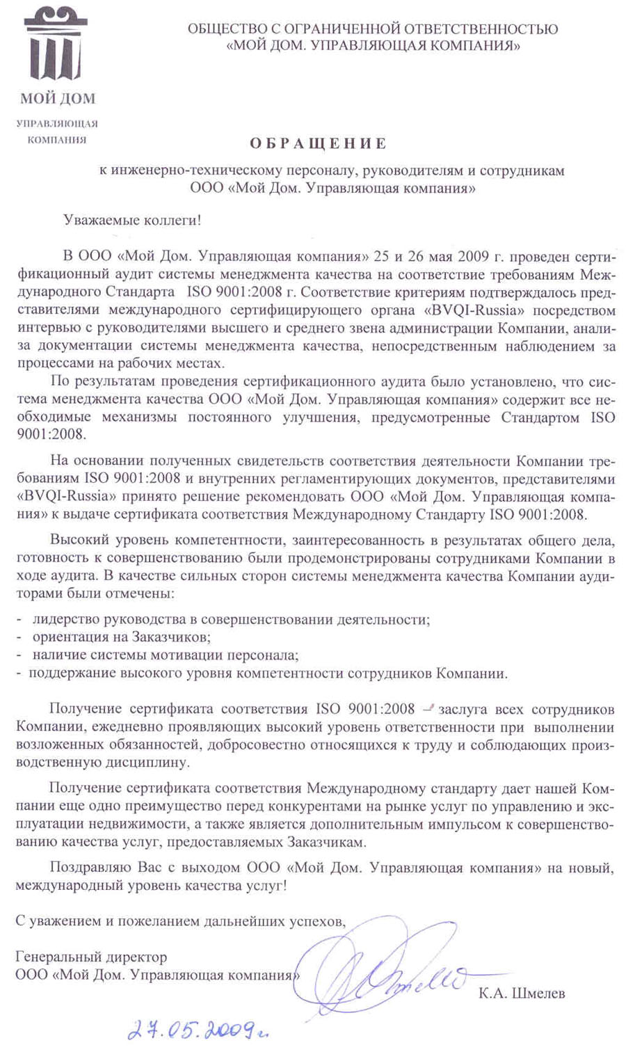 27 января 2009 года в ООО «Мой Дом. Управляющая компания» состоялось совещание