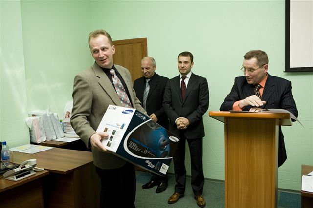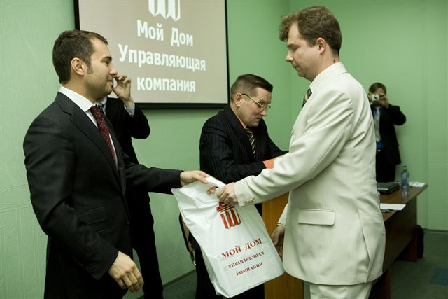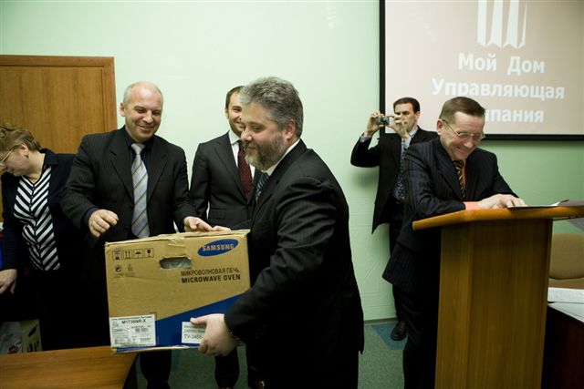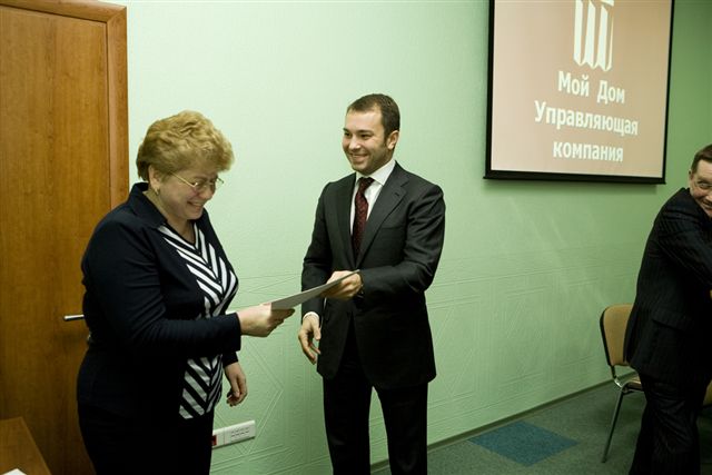 В заключение совещания был доведен приказ Генерального директора ООО «Мой Дом. Управляющая компания» о поощрении инженерно-технического персонала компании по итогам работы за 2007 год. Наиболее отличившимся сотрудникам были вручены ценные подарки, денежные премии, грамоты. Ряду сотрудников установлены персональные оклады.